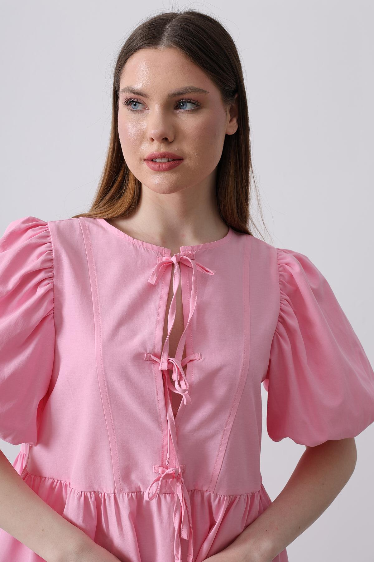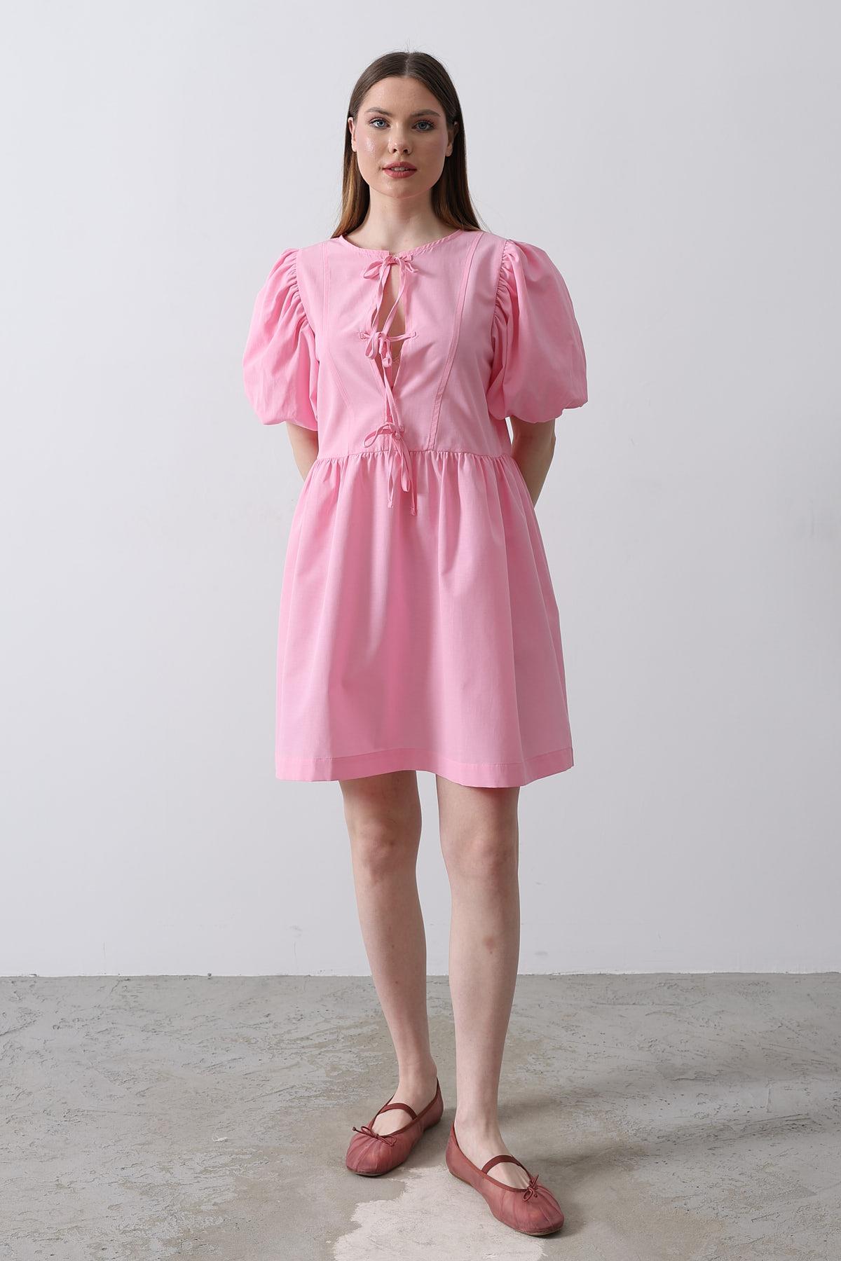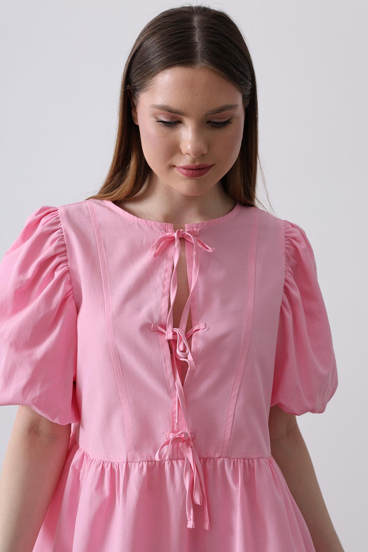 Un capo fresco, romantico e versatile. Questo abito rosa in 100% cotone unisce comfort e stile grazie al suo taglio in vita svasato, alle maniche a palloncino e ai fiocchetti sul davanti che aggiungono un tocco femminile e delicato. Perfetto da indossare sia in chiave sportiva con sneakers, sia in versione elegante con sandali o tacchi.