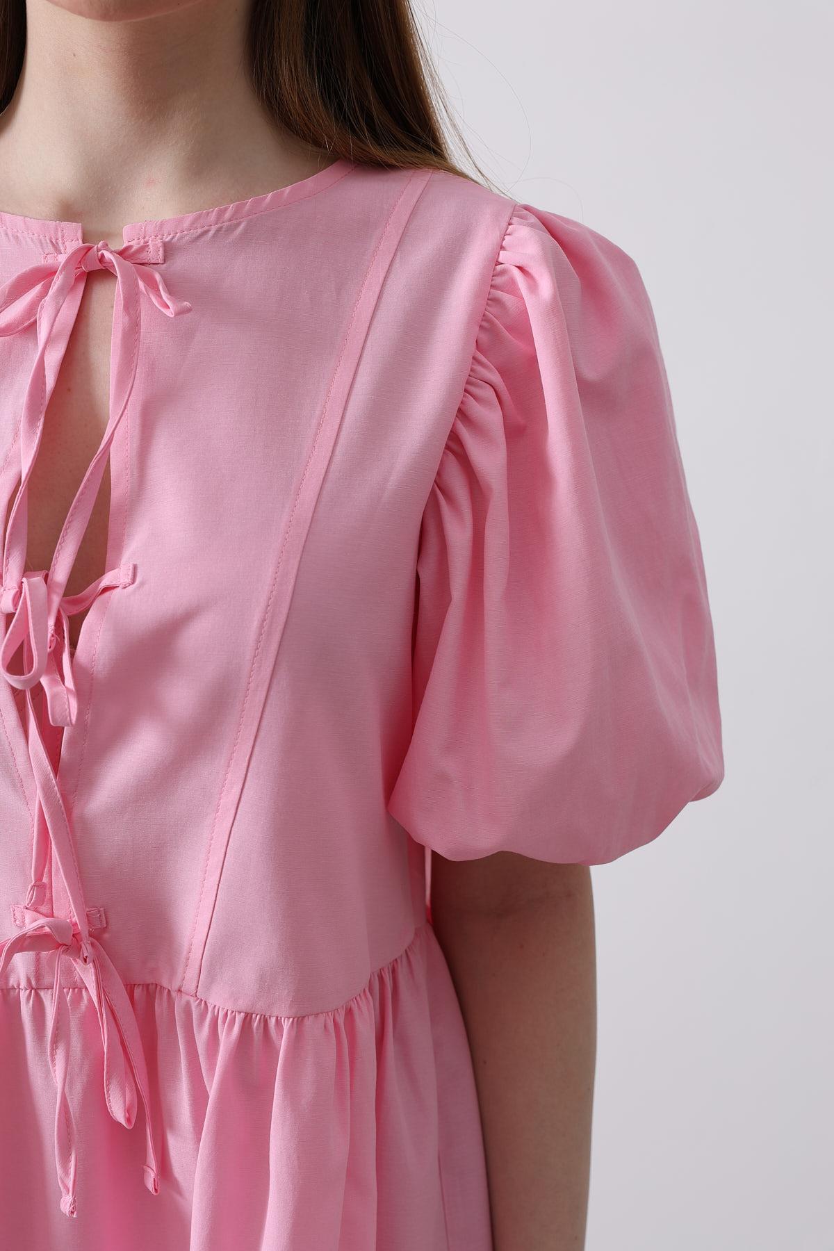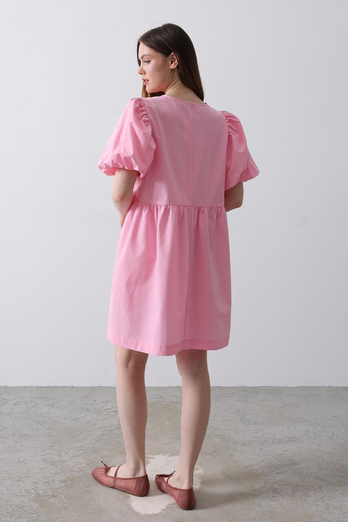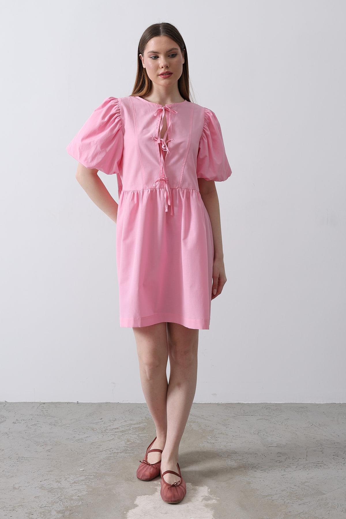 Un capo fresco, romantico e versatile. Questo abito rosa in 100% cotone unisce comfort e stile grazie al suo taglio in vita svasato, alle maniche a palloncino e ai fiocchetti sul davanti che aggiungono un tocco femminile e delicato. Perfetto da indossare sia in chiave sportiva con sneakers, sia in versione elegante con sandali o tacchi.