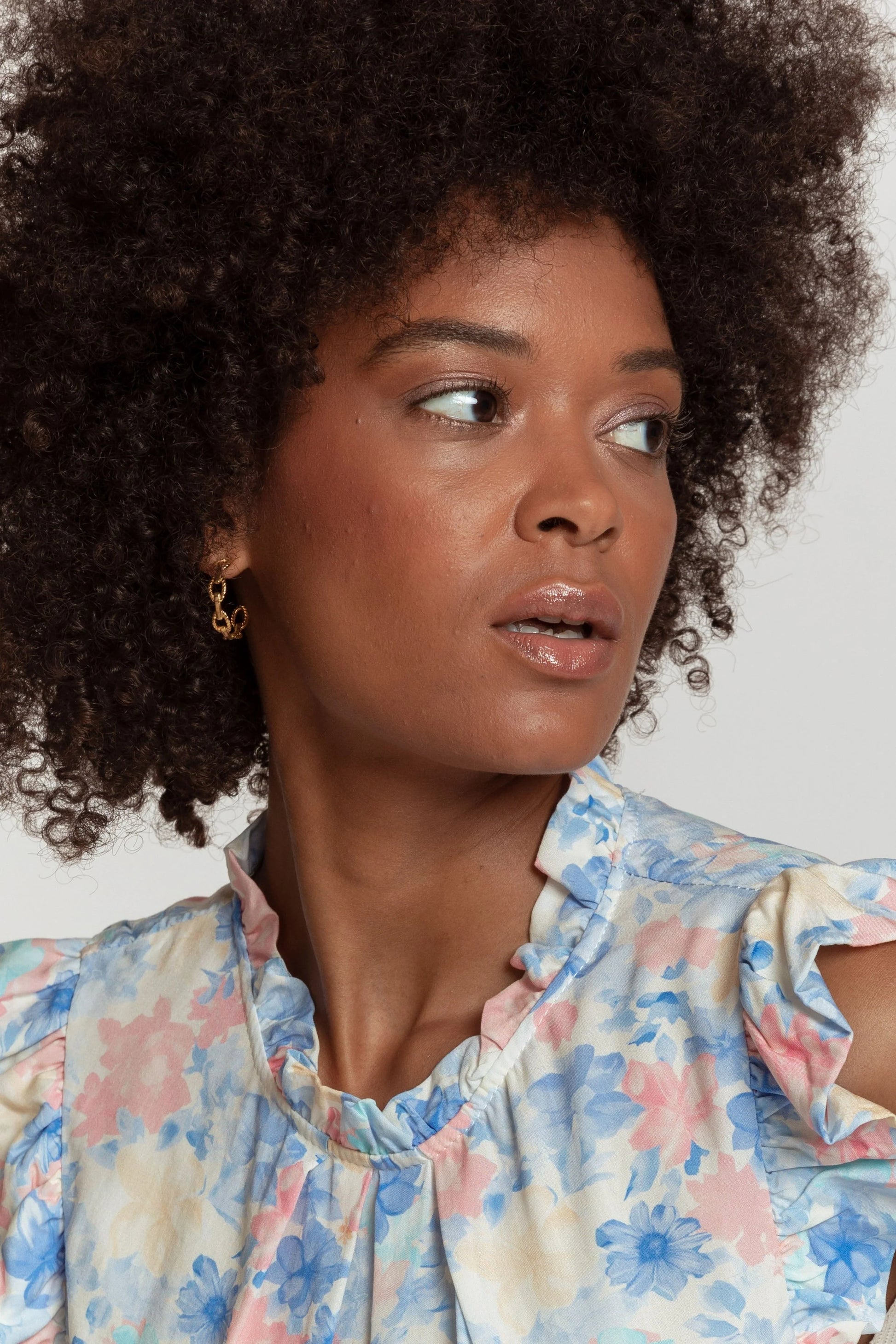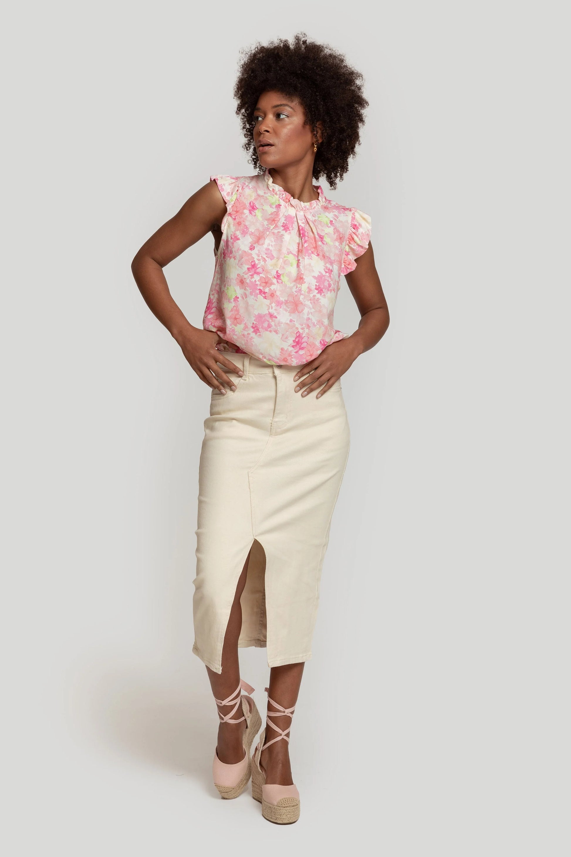 Leggera e versatile, questa blusa in tessuto fluido presenta un design lineare impreziosito da una stampa delicata. Il collo rotondo con chiusura a bottoncino sul retro dona un tocco elegante e raffinato. Le maniche a giromanica sono valorizzate da un volant romantico, perfetto per aggiungere movimento e stile al look. Ideale da abbinare a jeans, gonne o pantaloni eleganti per un outfit casual o più elegante.