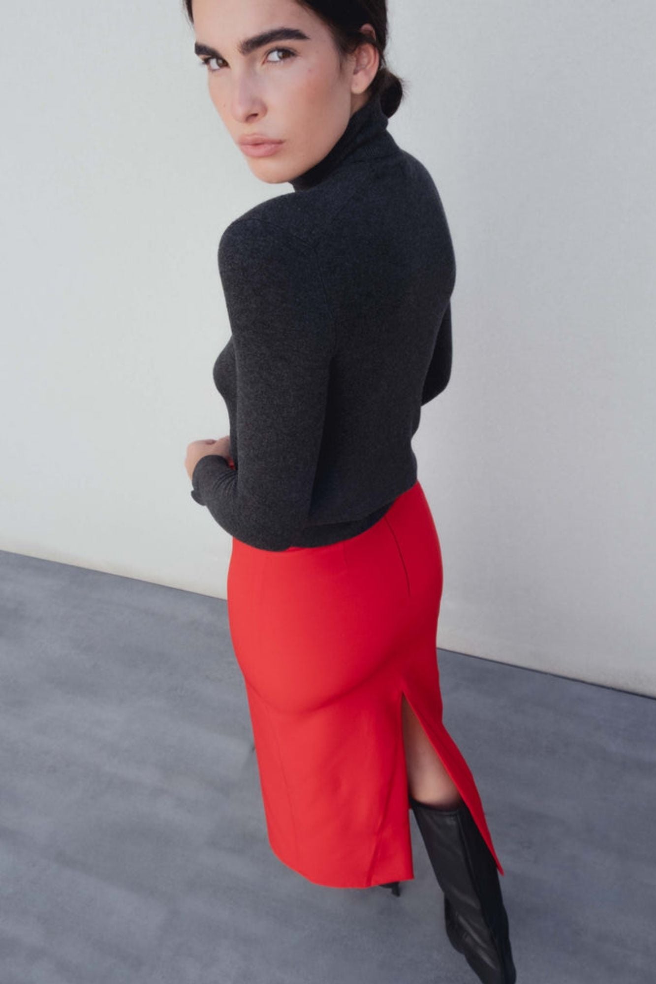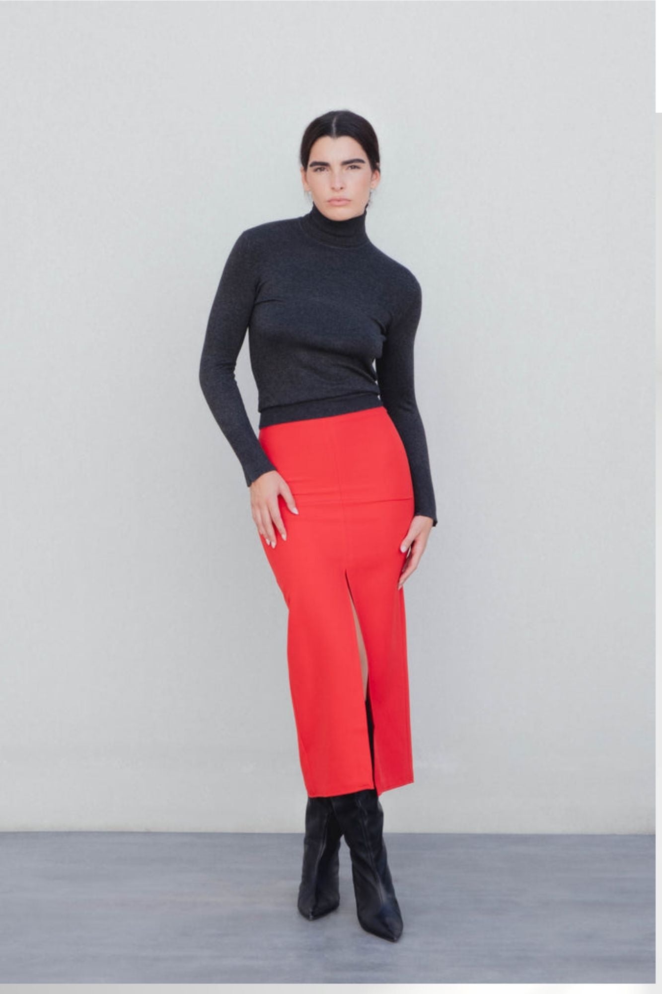Una gonna midi dal carattere deciso, pensata per valorizzare la silhouette. Il taglio molto aderente esalta le forme in modo elegante, mentre le aperture sia sul fronte che sul retro donano movimento e femminilità. La chiusura con zip invisibile assicura una finitura pulita e sofisticata. In un intenso rosso, è il capo ideale per look audaci e raffinati.