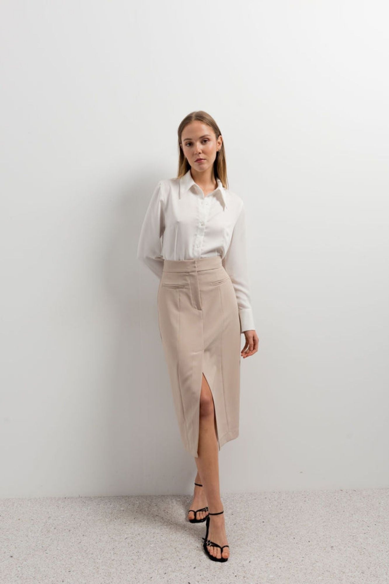Raffinata e femminile, questa gonna midi a vita alta è pensata per valorizzare la silhouette con un’eleganza naturale. L’apertura frontale dona movimento e slancia la figura, rendendola perfetta sia per look quotidiani che per outfit più ricercati. Il tessuto elasticizzato assicura comfort e una vestibilità che segue le forme senza costringerle.