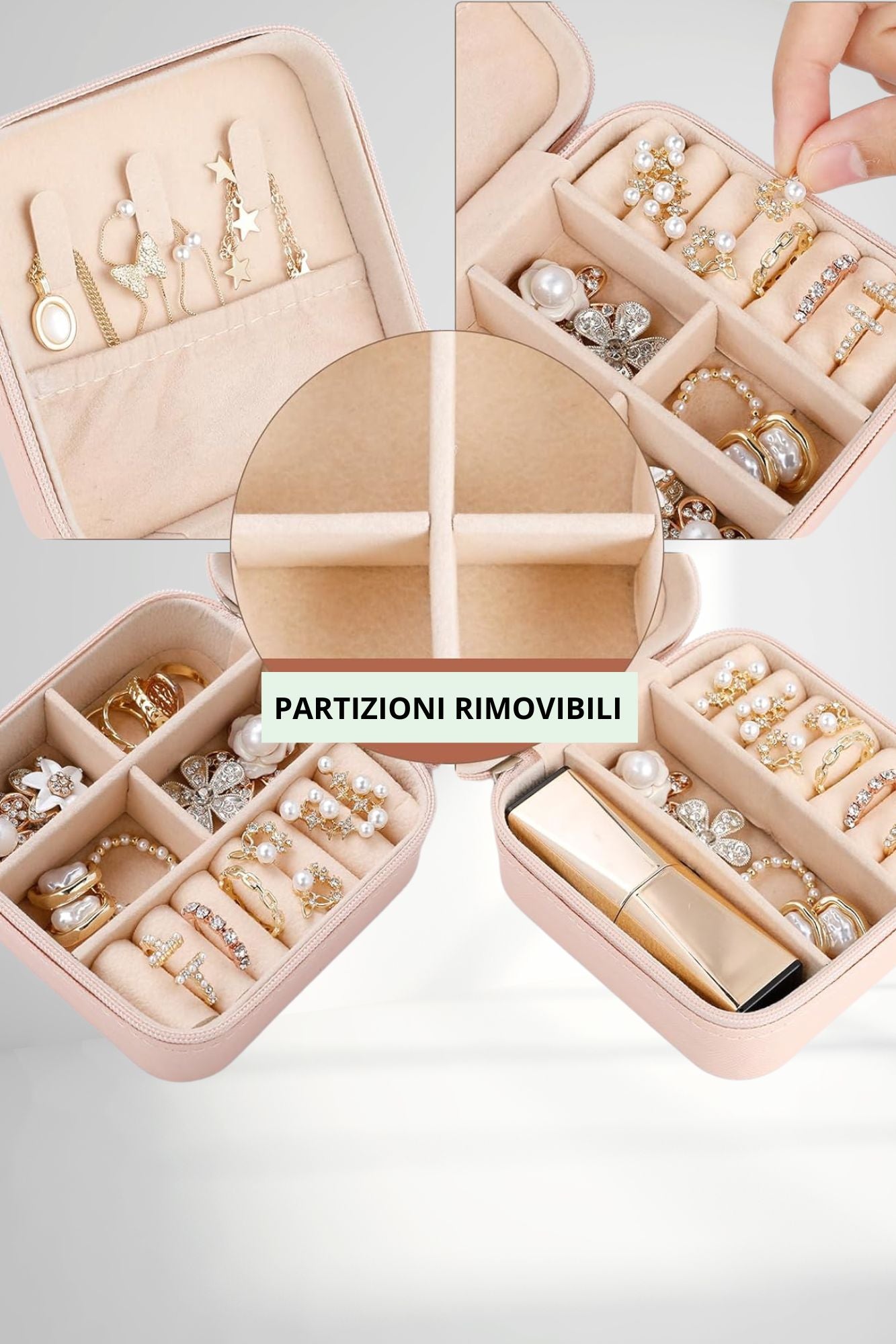 Include scomparti rimovibili ideali per separare ciondoli, spille o piccoli oggetti preziosi.