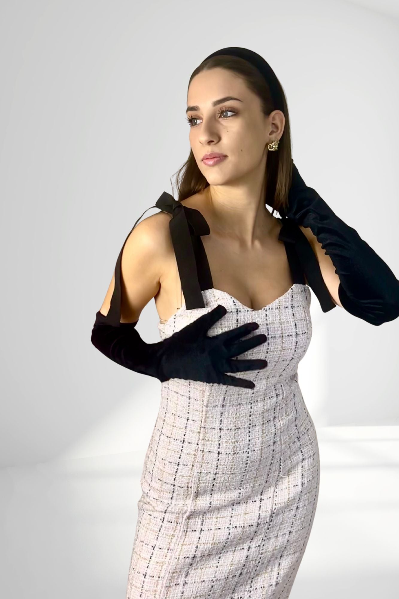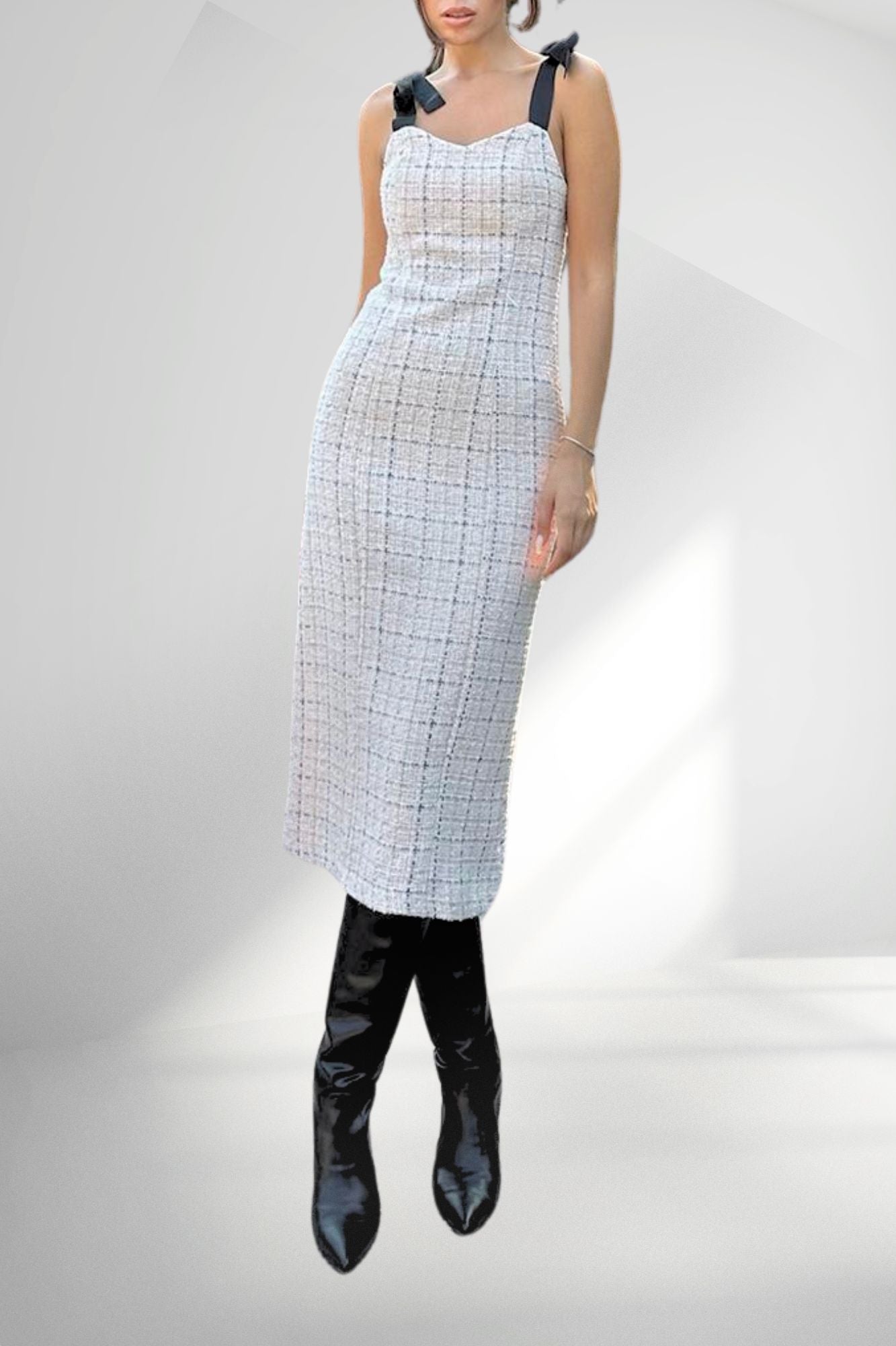 Lasciati conquistare dall'eleganza senza tempo di questo abito tubino in tweed, impreziosito da raffinati fiocchetti neri sulle spalle e un audace spacco sul retro. Un capo sofisticato e femminile, perfetto per occasioni speciali o look formali con un tocco glamour.